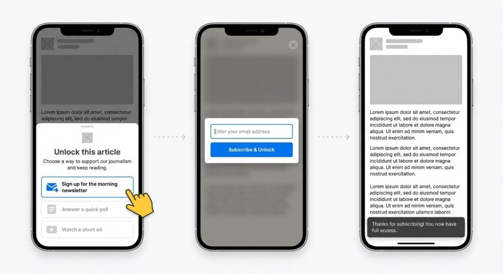 The concept acts as a monetization bridge: readers who arenât ready to subscribe still generate revenue at eCPMs typically exceeding âŹ30, while building familiarity with the contentâs value.
